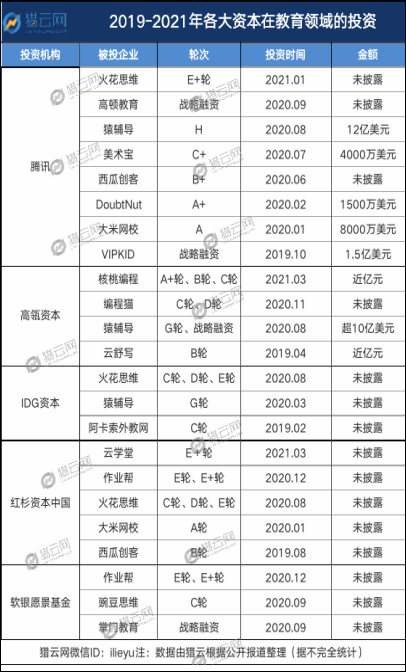 獵云網(wǎng)梳理到,例如騰訊、高瓴資本、IDG資本、軟銀愿景基金、紅杉資本中國等機(jī)構(gòu),在近兩年對K12頭部教育公司的投資較為頻繁,大肆下注且金額不低。