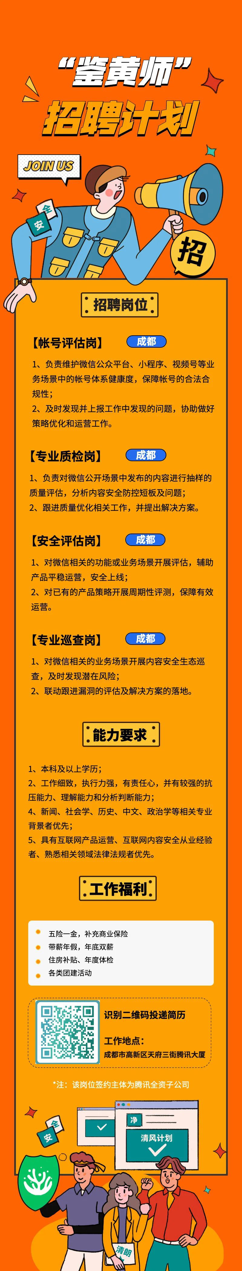 2021-08-12 16:42:04閱讀()互聯(lián)網(wǎng)8月12日消息 近期微信珊瑚安全官方發(fā)布《微信“鑒黃師”招人,速來(lái)》,并且公布了公司的相關(guān)崗位招聘,也就是“鑒黃師”招聘計(jì)劃,其中包括賬號(hào)評(píng)估崗、專業(yè)質(zhì)檢崗、安全評(píng)估崗、專業(yè)巡查崗。