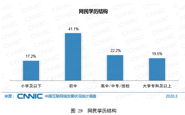 此外,初中、高中/中專/技校學(xué)歷的網(wǎng)民群體占比分別為41.1%、22.2%,受過大學(xué)??萍耙陨辖逃木W(wǎng)民群體占比為19.5%。