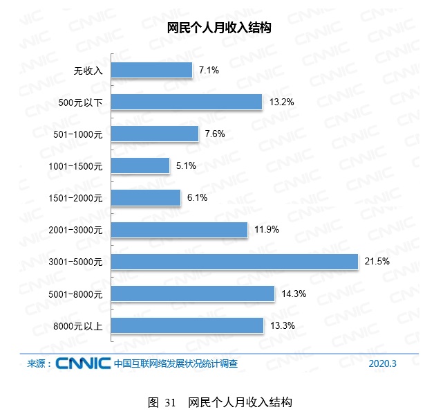 4月28日消息,CNNIC今日發(fā)布第45次互聯(lián)網(wǎng)發(fā)展報告,截至2020年3月 ,中國網(wǎng)民規(guī)模為9.04億。其中,月收入在5000元以上的網(wǎng)民群體占比為27.6%,也就是說,全國72.4%的網(wǎng)民(約6.5億人)收入不足5000元。其中,有收入但月收入在1000元以下的網(wǎng)民群體占比為20.8%;月收入在2001-5000元的網(wǎng)民群體合計占比為33.4%。