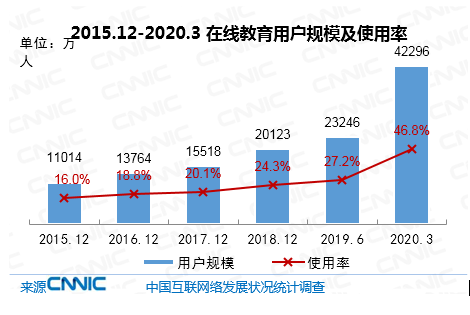 截至2020年3月,我國在線教育用戶規(guī)模達(dá)4.23億,較2018年底增長2.22億,占網(wǎng)民整體的46.8%;手機(jī)在線教育用戶規(guī)模達(dá)4.20億,較2018年底增長2.26億,占手機(jī)網(wǎng)民的46.9%。受衛(wèi)生事件影響,全國大中小學(xué)開學(xué)推遲,教學(xué)活動改至線上,推動在線教育用戶規(guī)模快速增長。