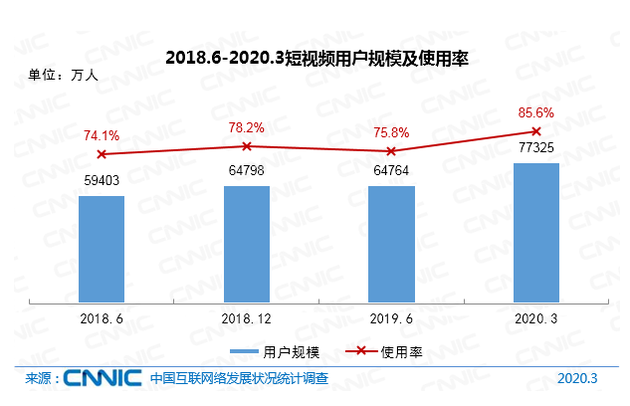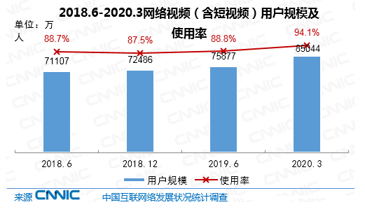 截至2020年3月,我國網(wǎng)絡(luò)視頻(含短視頻)用戶規(guī)模達(dá)8.50億,較2018年底增長1.26億,占網(wǎng)民整體的94.1%。其中短視頻用戶規(guī)模為7.73億,較2018年底增長1.25億,占網(wǎng)民整體的85.6%。2020年初,受衛(wèi)生事件影響,網(wǎng)絡(luò)視頻應(yīng)用的用戶規(guī)模、使用時(shí)長均有較大幅度提升。