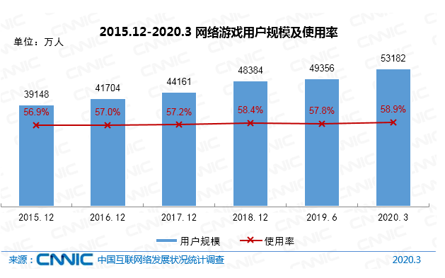 截至2020年3月,我國網(wǎng)絡(luò)游戲用戶規(guī)模達(dá)5.32億,較2018年底增長4798萬,占網(wǎng)民整體的58.9%;手機(jī)網(wǎng)絡(luò)游戲用戶規(guī)模達(dá)5.29億,較2018年底增長7014萬,占手機(jī)網(wǎng)民的59.0%。