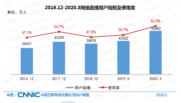 電商直播蓬勃發(fā)展,管理機(jī)制進(jìn)一步完善截至2020年3月,我國網(wǎng)絡(luò)直播用戶規(guī)模達(dá)5.60億,較2018年底增長1.63億,占網(wǎng)民整體的62.0%。其中,游戲直播的用戶規(guī)模為2.60億,較2018年底增長2204萬,占網(wǎng)民整體的28.7%;真人秀直播的用戶規(guī)模為2.07億,較2018年底增長4374萬,占網(wǎng)民整體的22.9%;演唱會直播的用戶規(guī)模為1.50億,較2018年底增長4137萬,占網(wǎng)民整體的16.6%;體育直播的用戶規(guī)模為2.13億,較2018年底增長3677萬,占網(wǎng)民整體的23.5%。在2019年興起并實(shí)現(xiàn)快速發(fā)展的電商直播用戶規(guī)模為2.65億,占網(wǎng)民整體的29.3%。