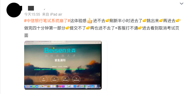 中信銀行校招筆試系統(tǒng)崩了上熱搜,網(wǎng)友曬出北森致歉