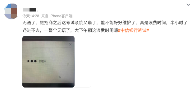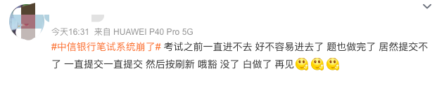 10月22日下午,大量網(wǎng)友在微博發(fā)文稱自己在參加中信銀行校招在線筆試時考試系統(tǒng)崩了。