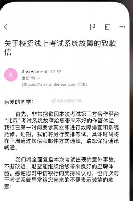 也有網(wǎng)友曬出了收到的中信銀行校招線上考試系統(tǒng)提供方北森發(fā)來的致歉信。