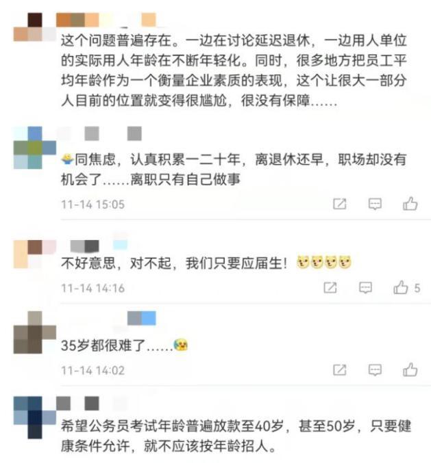 近年來,國家高度重視“35歲現(xiàn)象”,一些地區(qū)公務(wù)員招錄已經(jīng)在放寬年齡限制:比如山東事業(yè)編招考,多年來把招考年齡限制在40周歲以下。浙江今年宣布,對于2022年應(yīng)屆碩士、博士研究生(非在職人員),放寬到40周歲以下。今年全國兩會(huì),全國人大代表、編劇蔣勝男建議,取消國家公務(wù)員報(bào)考35歲以下的年齡限制。