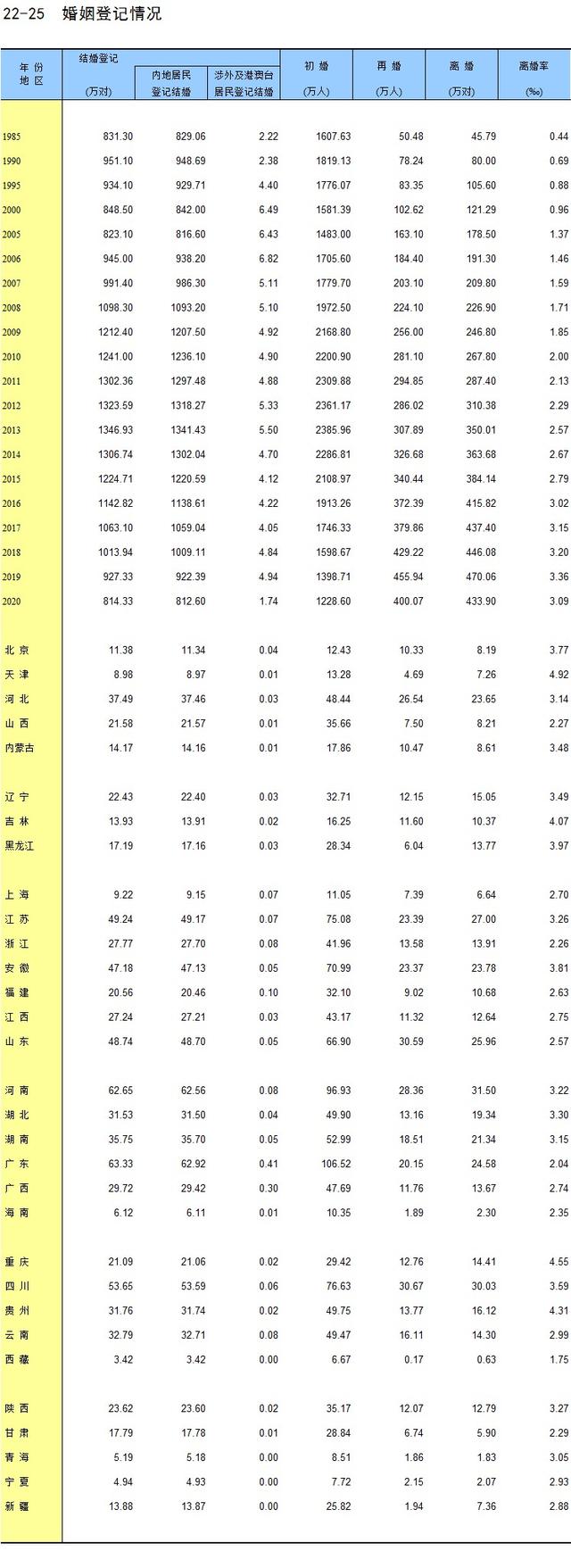國(guó)家統(tǒng)計(jì)局官網(wǎng)近期公布的《中國(guó)統(tǒng)計(jì)年鑒2021》已披露了2020年的婚姻登記情況。該統(tǒng)計(jì)年鑒備注信息顯示,包括婚姻登記情況在內(nèi)的社會(huì)服務(wù)統(tǒng)計(jì)資料由民政部和國(guó)家醫(yī)療保障局提供。
