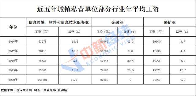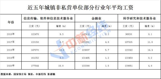 從城鎮(zhèn)非私營單位看,2016年,信息傳輸、軟件和信息技術(shù)服務(wù)業(yè)反超金融業(yè)成最賺錢行業(yè),平均工資達12.25萬元,并連續(xù)多年霸占“榜首”位置。2020年,該行業(yè)年平均工資達17.75萬元。