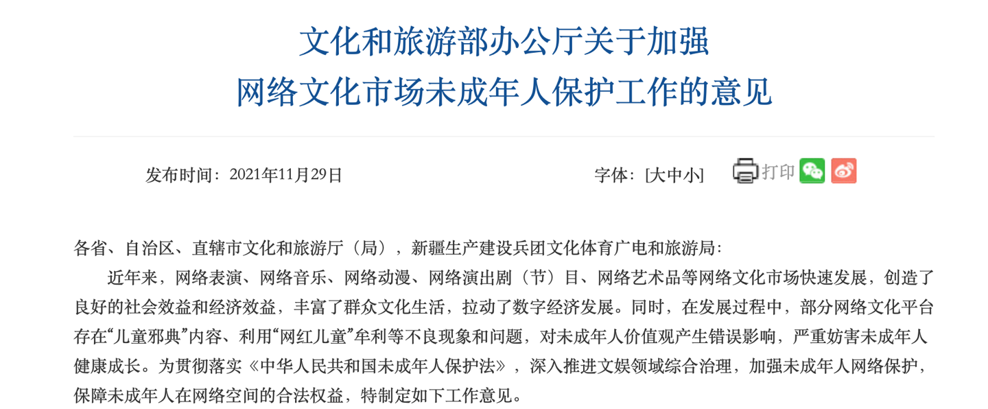 文化和旅游部辦公廳關(guān)于加強(qiáng)網(wǎng)絡(luò)文化市場(chǎng)未成年人保護(hù)工作的意見