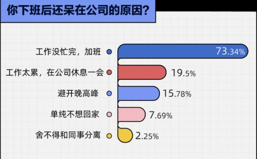 不過也有網(wǎng)友稱,自己曾經(jīng)都是活干完了到點(diǎn)就下班,但有同事曾私下跟他說下班以后多在公司留半個(gè)小時(shí)一個(gè)小時(shí)再走,下班就走領(lǐng)導(dǎo)看見了不好。