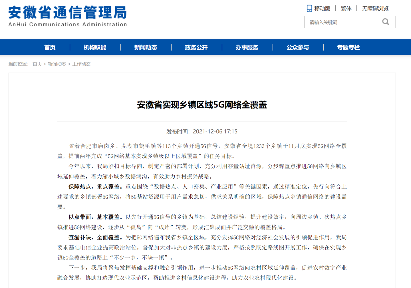 安徽:實(shí)現(xiàn)鄉(xiāng)鎮(zhèn)區(qū)域5G網(wǎng)絡(luò)全覆蓋