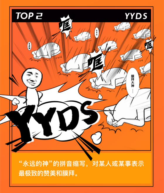 yyds是“永遠(yuǎn)的神”拼音首字母的縮寫,用來(lái)表達(dá)對(duì)于某個(gè)人、某個(gè)組織或者某件事最極致的贊美和膜拜。比如在今年的奧運(yùn)會(huì)上,一眾運(yùn)動(dòng)員的神技能、神操作,讓網(wǎng)友直呼中國(guó)隊(duì)yyds!