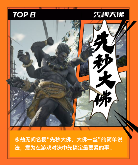 “先秒大佛”源自于《永劫無(wú)間》中的游戲角色天海和尚,人物釋放技能會(huì)變身成為一樽巨大的佛僧(故稱為“大佛”)且具有極強(qiáng)的戰(zhàn)斗力,所以玩家們?cè)谟螒蛑信龅酱蠓鸷?,通常?huì)在其血量見底時(shí)互相溝通“先秒大佛”。這個(gè)詞也可以引申意思也可以是快速搞定最重要的事情。