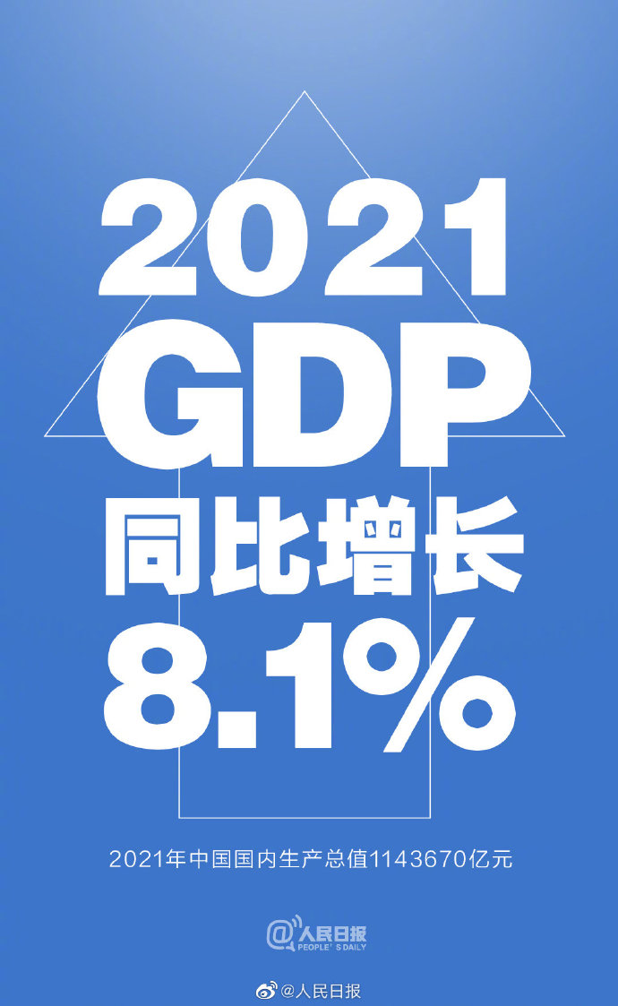 初步核算,2021年中國(guó)國(guó)內(nèi)生產(chǎn)總值1143670億元,按不變價(jià)計(jì)算,#2021年我國(guó)GDP比上年增長(zhǎng)8.1%#,兩年平均增長(zhǎng)5.1%。