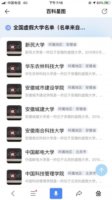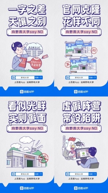 當(dāng)用戶搜索到野雞大學(xué)時(shí),百度也會(huì)在搜索結(jié)果中進(jìn)行強(qiáng)提示:“這是虛假大學(xué)”。
