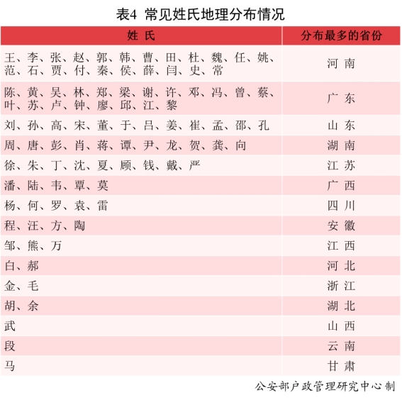 從整體分布看,常見姓氏分布廣泛,在全國31個省(區(qū)、市)均有分布,但同時也存在一定的空間聚集性。王、李、張等二十二個姓氏人口分布最多的省份是河南;陳、黃、吳等二十個姓氏人口分布最多的省份是廣東;劉、孫、高等十二個姓氏人口分布最多的省份是山東;周、唐、彭等十一個姓氏人口分布最多的省份是湖南;徐、朱、丁等九個姓氏人口分布最多的省份是江蘇;潘、陸、韋等五個姓氏人口分布最多的省份是廣西;楊、何、羅等五個姓氏人口分布最多的省份是四川;程、汪、方等四個姓氏人口分布最多的省份是安徽;鄒、熊、萬三個姓氏人口分布最多的省份是江西;白、郝兩個姓氏人口分布最多的省份是河北;金、毛兩個姓氏人口分布最多的省份是浙江;胡、余兩個姓氏人口分布最多的省份是湖北;武姓、段姓、馬姓人口分布最多的省份分別是山西、云南和甘肅。(詳見表4)