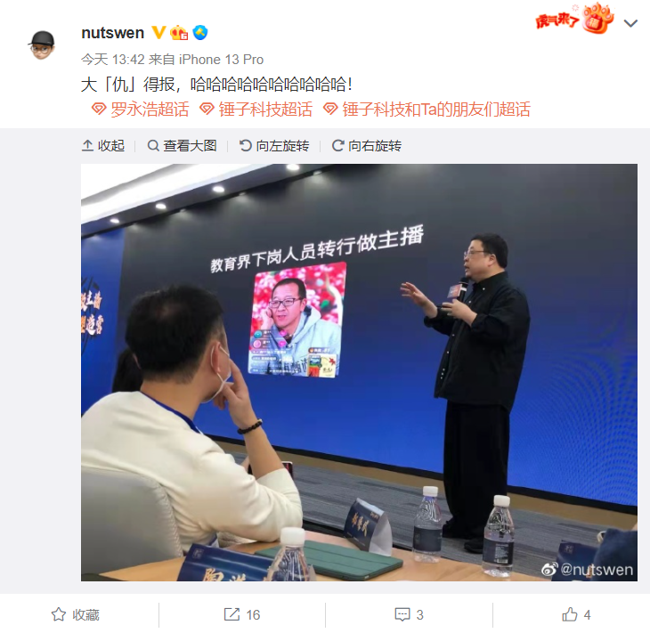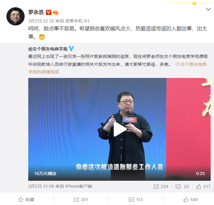 而后,交個(gè)朋友電商學(xué)苑微博把相關(guān)的直播視頻片段發(fā)布了出來,羅永浩轉(zhuǎn)發(fā)繼續(xù)表示,“呵呵,做點(diǎn)事不容易。希望那些喜歡煽風(fēng)點(diǎn)火,熱愛造謠傳謠的人都出事,出大事。”