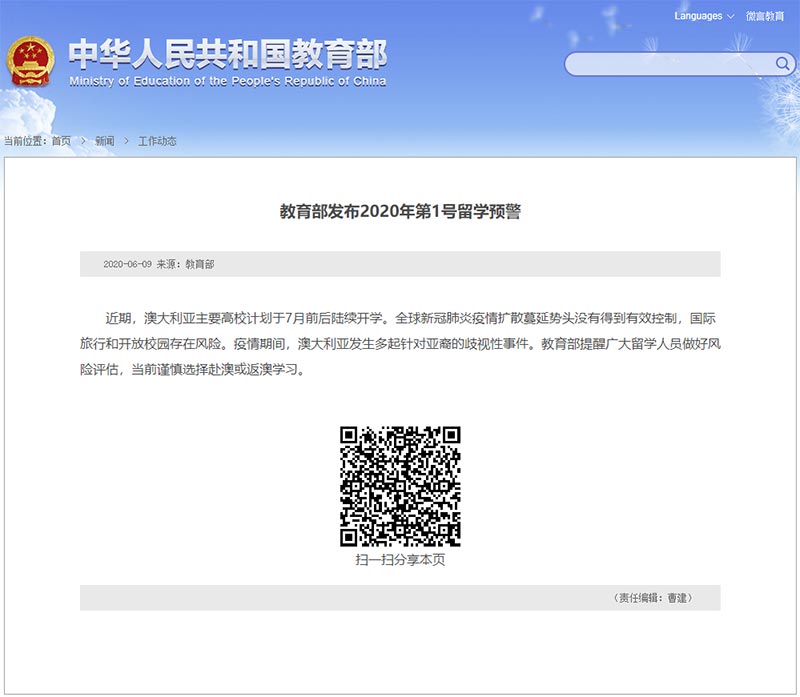 2020-06-09 15:33:58閱讀()教育部近期,澳大利亞主要高校計劃于7月前后陸續(xù)開學(xué)。全球新冠肺炎疫情擴(kuò)散蔓延勢頭沒有得到有效控制,國際旅行和開放校園存在風(fēng)險。疫情期間,澳大利亞發(fā)生多起針對亞裔的歧視性事件。教育部提醒廣大留學(xué)人員做好風(fēng)險評估,當(dāng)前謹(jǐn)慎選擇赴澳或返澳學(xué)習(xí)。
