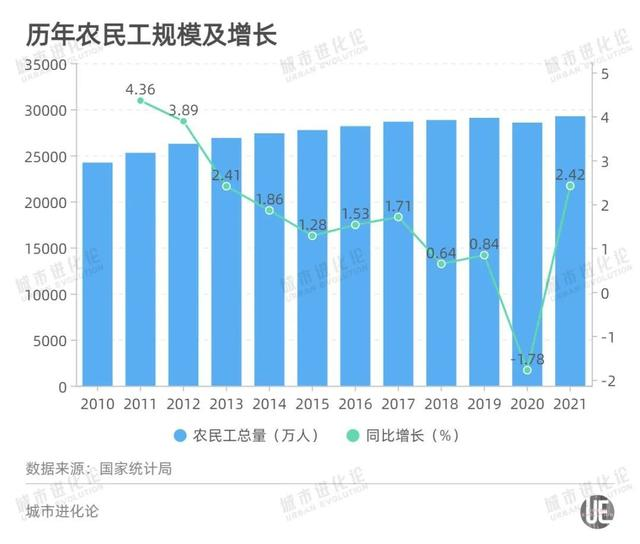 總體來看,我國農(nóng)民工總量從2010年的2.42億人,一路增至2019年的2.91億人,2020年疫情之下稍有回流,2021年離開了農(nóng)村、離開了田地的人又恢復(fù)到2.93億的水平。