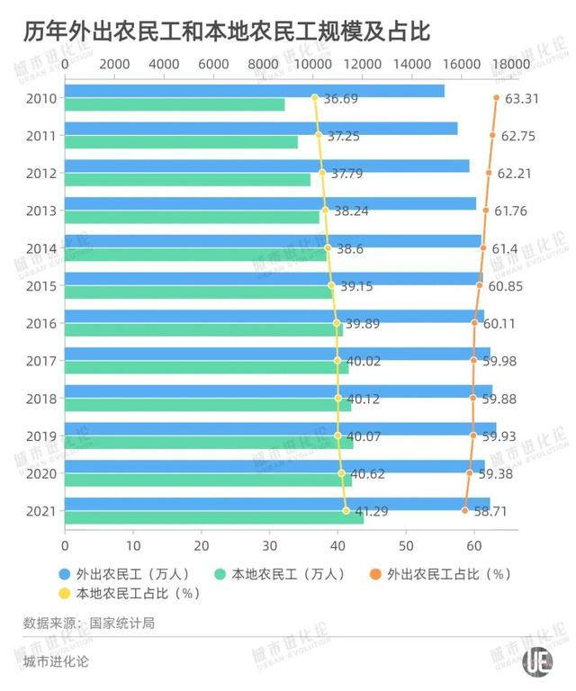 2021年,留在自己鄉(xiāng)鎮(zhèn)的農(nóng)民工又增加了,達(dá)到1.21億人,占四成有余;外出農(nóng)民工雖然是主流,為1.72億人,不過占比一直在下降,從2010年的63.31%下滑至2021年的58.71%。