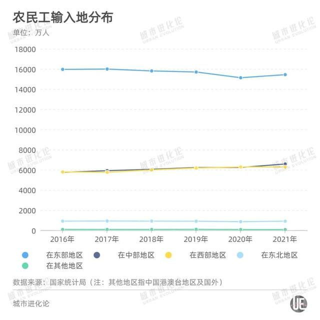 相比之下,中部、西部地區(qū)吸納的農(nóng)民工數(shù)量占比出現(xiàn)明顯上升。2021年,在中部和西部地區(qū)的農(nóng)民工數(shù)量相比2016年分別增加825萬、496萬。東北和其他(注:指中國港澳臺地區(qū)及國外)地區(qū)則小幅下降。