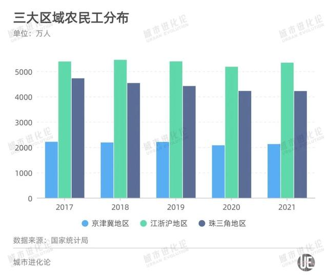 珠三角地區(qū)尤其突出,2017年在珠三角地區(qū)的農(nóng)民工尚有4722萬人,4年減少逾500萬,2021年為4219萬人。