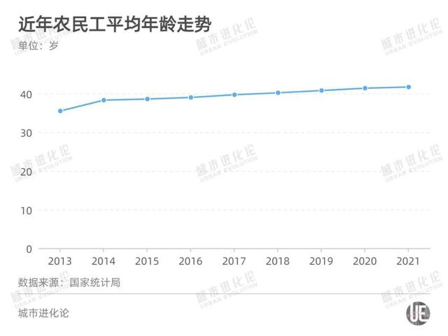 整體來看,全國農(nóng)民工的平均年齡逐年提高。2013年農(nóng)民工平均年齡35.5歲,2021年已經(jīng)達(dá)到41.7歲。