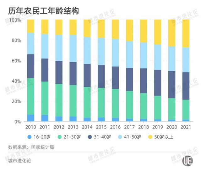 與之形成對比的是,21-30歲農(nóng)民工占比不斷下降。2010年這群年輕農(nóng)民工占比尚有35.9%,近年來一路縮減,2021年其占比首次跌破20%,只剩19.6%。