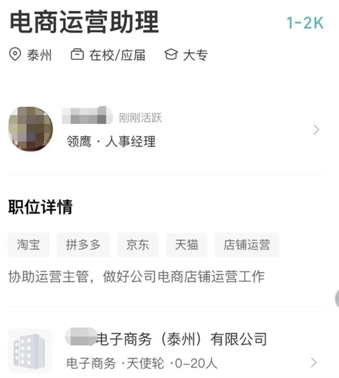 網(wǎng)傳截圖顯示,江蘇泰州一公司正在招募電商運(yùn)營(yíng)助理。招聘詳情稱,公司創(chuàng)新目前招募兩個(gè)崗位:一個(gè)是客服崗位,一個(gè)是運(yùn)營(yíng)崗位。