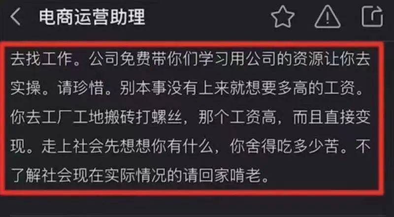 值得注意的是,該職位詳情一欄介紹:“想做運(yùn)營(yíng)崗位又沒(méi)本事的朋友第一個(gè)月800元工資,不要覺(jué)得少,請(qǐng)放下姿態(tài),別本事沒(méi)有上來(lái)就想要多高的工資。”該招聘信息中還提到:“走上社會(huì)先想想你有什么,不了解社會(huì)現(xiàn)在實(shí)際情況的請(qǐng)回家啃老”。