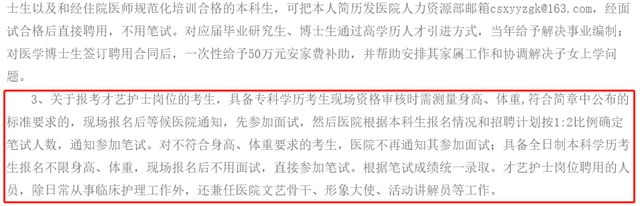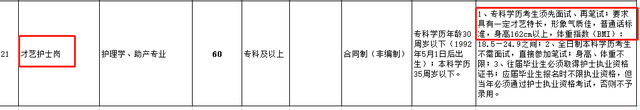 值得注意的是,該崗位在“其他條件”中要求:“專科學(xué)歷考生須先面試、再筆試;要求具有一定才藝特長,形象氣質(zhì)佳,普通話標(biāo)準(zhǔn),身高162cm以上,體重指數(shù)(BMI):18.5—24.9之間”,但“全日制本科學(xué)歷考生不需面試,直接參加筆試;身高、體重不限”;往屆生須具有護(hù)士執(zhí)業(yè)資格證書(或成績合格證),應(yīng)屆生暫時不限執(zhí)業(yè)證書,但當(dāng)年必須參加護(hù)士執(zhí)業(yè)資格考試并成績合格,否則不予錄用。”