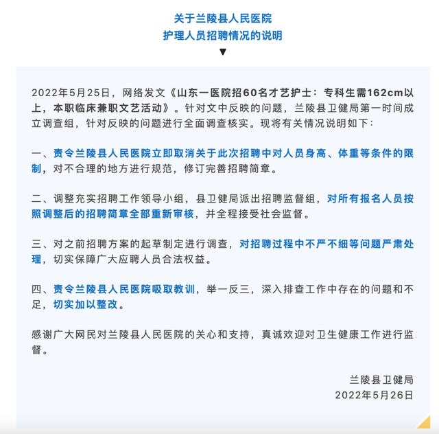 5月26日晚間,蘭陵縣衛(wèi)健局針對此事發(fā)布說明稱,取消關(guān)于此次招聘中對人員身高、體重等條件的限制,對招聘過程中不嚴(yán)不細(xì)等問題嚴(yán)肅處理。