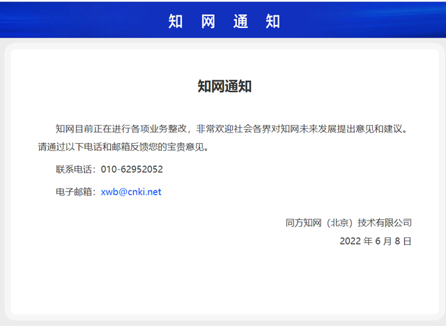 2022-06-10 10:20:28閱讀()知網(wǎng)6月8日,同方知網(wǎng)(北京)技術(shù)有限公司發(fā)布通知稱,知網(wǎng)目前正在進(jìn)行各項業(yè)務(wù)整改,非常歡迎社會各界對知網(wǎng)未來發(fā)展提出意見和建議。請通過以下電話和郵箱反饋您的寶貴意見。聯(lián)系電話:010-62952052;電子郵箱:xwb@cnki.net