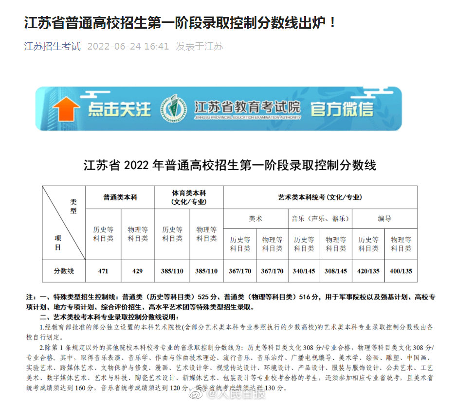 【#2022高考江蘇分?jǐn)?shù)線#】普通類本科:歷史等科目類471 分,物理等科目類429分。 ???
