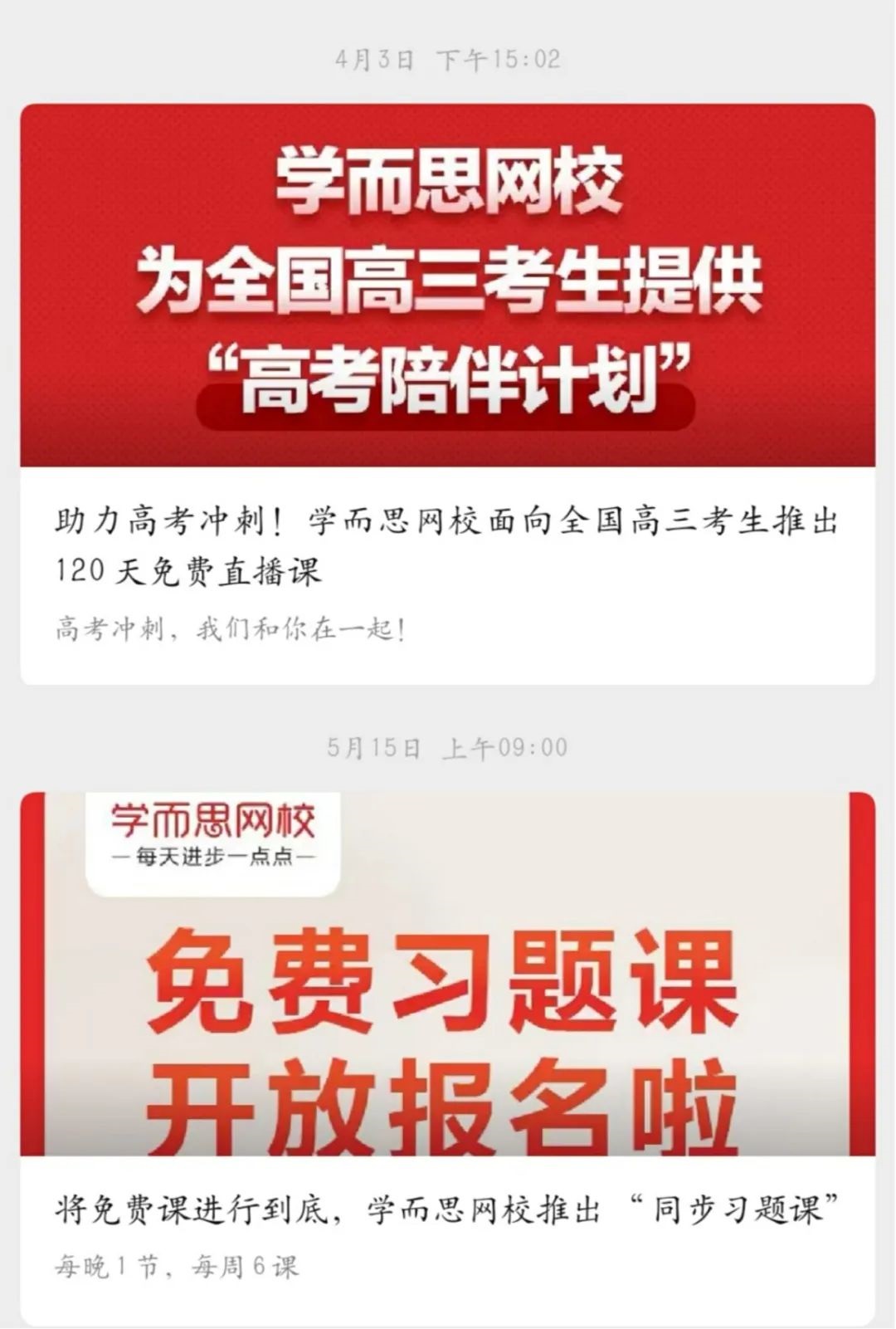 記者注意到,學而思網(wǎng)校在 4 月 3 日通過官方微信宣布面向高三學生推出 120 天免費直播課。緊接著,5 月 15 日又再次宣布 “將免費課進行到底”,每周一到周六每天晚上開設(shè) 40 分鐘的同步習題課,覆蓋小學一年級到初中三年級。