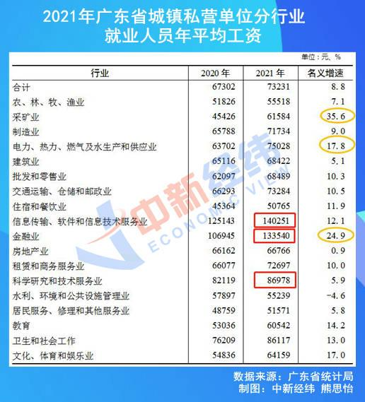 以廣東省為例,分行業(yè)門類看,年平均工資最高的分別是信息傳輸、軟件和信息技術(shù)服務(wù)業(yè)140251元,金融業(yè)133540元,科學(xué)研究和技術(shù)服務(wù)業(yè)86978元;從增長速度看,年平均工資增速最高的三個(gè)行業(yè)門類依次為采礦業(yè),金融業(yè)和電力、熱力、燃?xì)饧八a(chǎn)和供應(yīng)業(yè),分別增長35.6%、24.9%和17.8%。