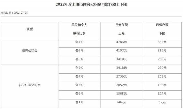 另外,上海住房公積金和補充住房公積金繳存基數最高不超過34188元,最低不低于2590元。住房公積金按職工本人和單位各7%的繳存比例所對應的月繳存額上限為4786元,月繳存額下限為362元。