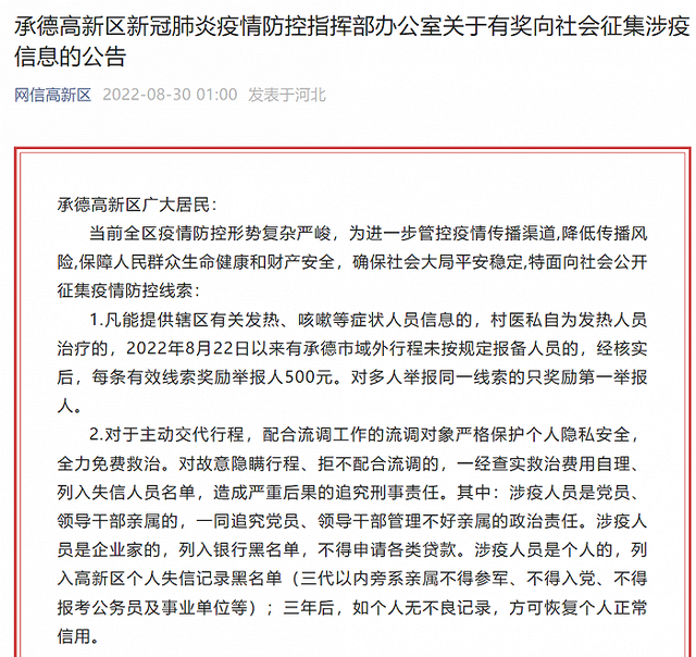 同日早前,“網信高新區(qū)”微信公眾號消息,承德高新區(qū)新冠肺炎疫情防控指揮部辦公室通告,當前全區(qū)疫情防控形勢復雜嚴峻,為進一步管控疫情傳播渠道,降低傳播風險,保障人民群眾生命健康和財產安全,確保社會大局平安穩(wěn)定,特面向社會公開征集疫情防控線索: