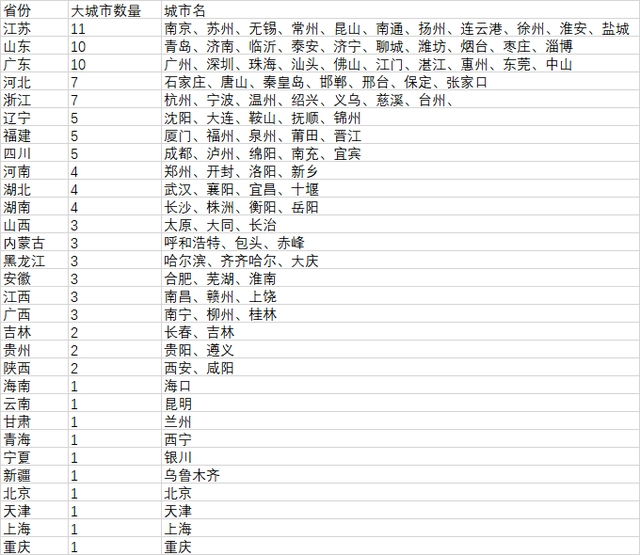 東北三省中,遼寧有5個(gè)大城市,黑龍江有3個(gè),吉林有2個(gè),三省合計(jì)達(dá)10個(gè)??傮w上看,東三省的大城市數(shù)量并不少。