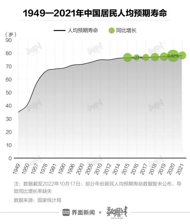 國家統(tǒng)計局?jǐn)?shù)據(jù)顯示,新中國成立初期我國人均預(yù)期壽命僅為35歲,而在2021年,我國人均預(yù)期壽命已上漲43.2歲至78.2歲,漲幅達123.43%。界面數(shù)據(jù)統(tǒng)計發(fā)現(xiàn),2015年-2021年,我國人均預(yù)期壽命逐年增長,但增幅較小且值呈波動趨勢,均在1%以下。