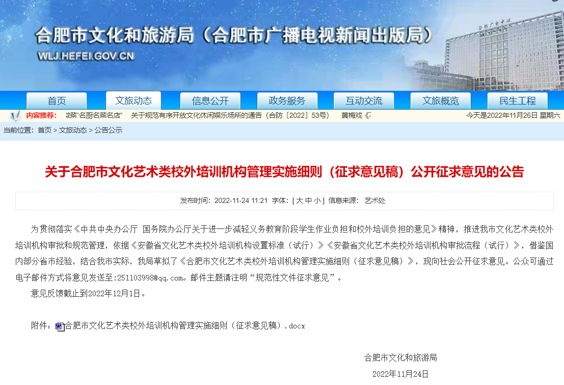 2022-11-28 09:01:34閱讀()合肥市文化和旅游局據(jù)合肥市文化和旅游局官網(wǎng)11月24日消息 為貫徹落實《中共中央辦公廳 國務院辦公廳關于進一步減輕義務教育階段學生作業(yè)負擔和校外培訓負擔的意見》精神,推進合肥市文化藝術類校外培訓機構審批和規(guī)范管理,依據(jù)《安徽省文化藝術類校外培訓機構設置標準(試行)》《安徽省文化藝術類校外培訓機構審批流程(試行)》,借鑒國內(nèi)部分省市經(jīng)驗,結合合肥市實際,合肥市文化和旅游局草擬了《合肥市文化藝術類校外培訓機構管理實施細則(征求意見稿)》,現(xiàn)向社會公開征求意見。細則擬提出,這些培訓結束時間不得晚于20:30。