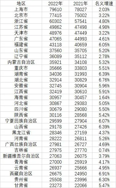 表:31個省份2022年居民人均可支配收入及名義增速(單位:元。來源:根據(jù)國家統(tǒng)計局數(shù)據(jù)整理)