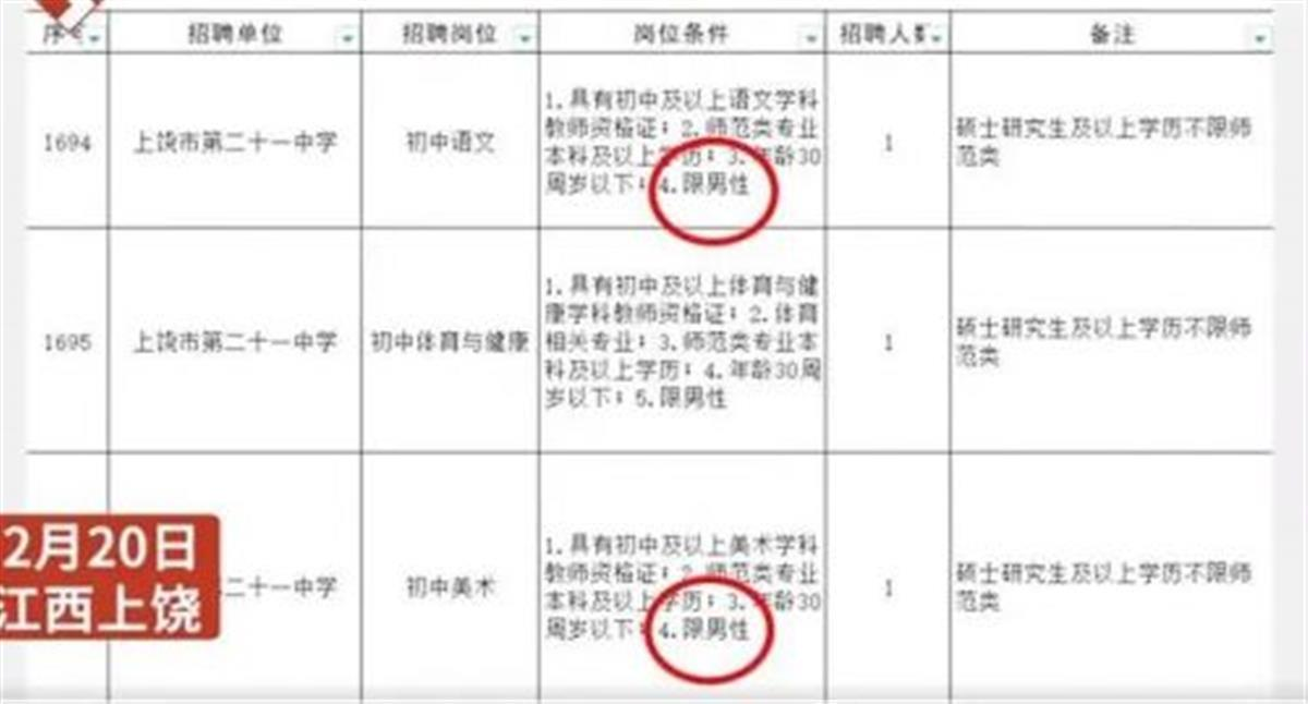 2023-02-21 16:16:41閱讀()極目新聞2月20日,江西上饒。網(wǎng)友爆料一中學(xué)招聘語(yǔ)文和美術(shù)教師只招收男性,引發(fā)熱議。該學(xué)校工作人員回應(yīng)稱:該校為特殊教育學(xué)校,招男性更方便管理,并且該特殊招聘原因已在教育局備案。(據(jù)2月21日九派新聞)