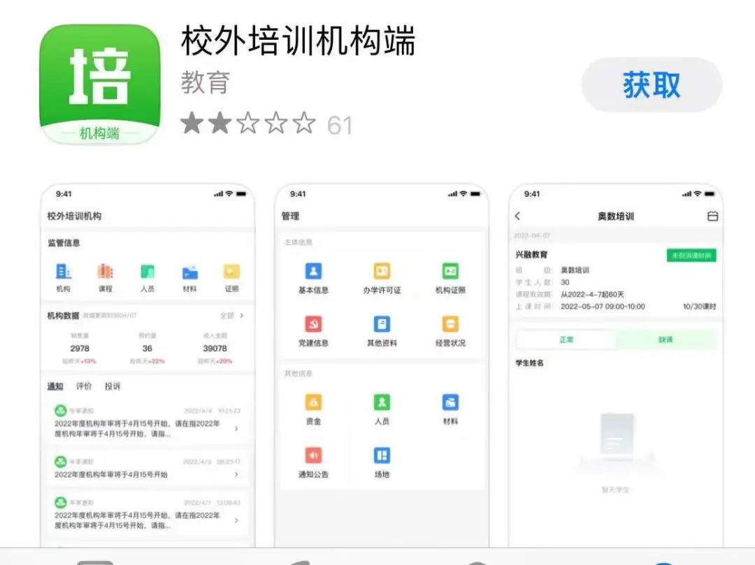 而針對線下教育培訓機構(gòu),教育部旗下中央電化教育館還推出了“校外培訓機構(gòu)端”App,支撐落實備案審批制度。同時,還推出了“校外培訓管理端”App,形成教育培訓監(jiān)管與服務的App矩陣。