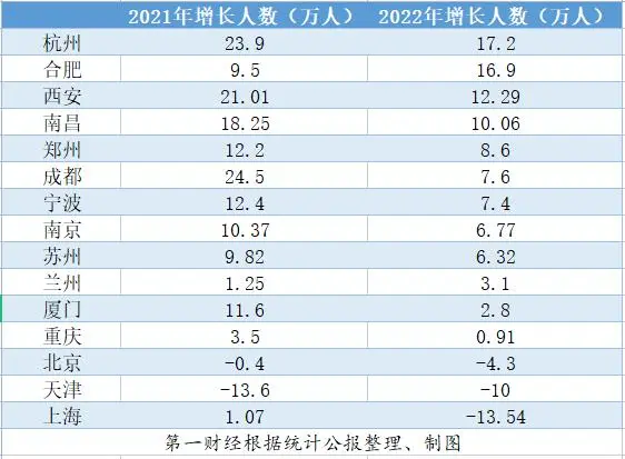 人口增長放緩的情形在大城市中普遍存在。第一財(cái)經(jīng)梳理了直轄市、省會城市和副省級城市等主要中心城市的人口數(shù)據(jù),在已經(jīng)公布人口數(shù)據(jù)的15個(gè)城市中,僅有合肥和蘭州的人口增量有所增長,2021年合肥和蘭州分別增長9.6萬和1.25萬人,2022年分別增長16.9萬和3.1萬人。