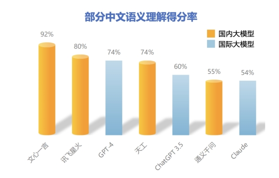 在生成質(zhì)量方面,基于對語義理解、輸出表達(dá)、適應(yīng)泛化的綜合評測,文心一言得分率76.98%,僅次于GPT-4,領(lǐng)先于包括ChatGPT在內(nèi)的其他大語言模型。其中,在部分中文語義理解方面,文心一言以92%的得分率排名榜首。