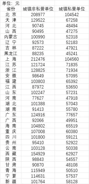 表:2022年31省份城鎮(zhèn)非私營單位、城鎮(zhèn)私營單位就業(yè)人員平均工資。(來源:《中國統(tǒng)計(jì)年鑒2023》)