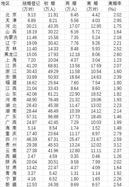表:2022年31個(gè)省份結(jié)婚登記、初婚、再婚、離婚及離婚率數(shù)據(jù)(數(shù)據(jù)來(lái)源:《中國(guó)統(tǒng)計(jì)年鑒2023》)